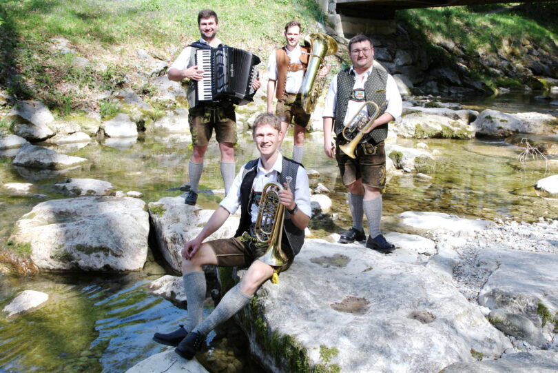 Mit Basstrompete, Flügelhorn, Tuba und Akkordeon spielen die 4 jungen Hinterberger Musikanten aus der Gegend rund um Nußdorf am Donnerstag, den 17. Juli von 19 Uhr bis 21:30 Uhr im Brunnenhof des Bad Aiblinger Kurhauses zünftig auf.