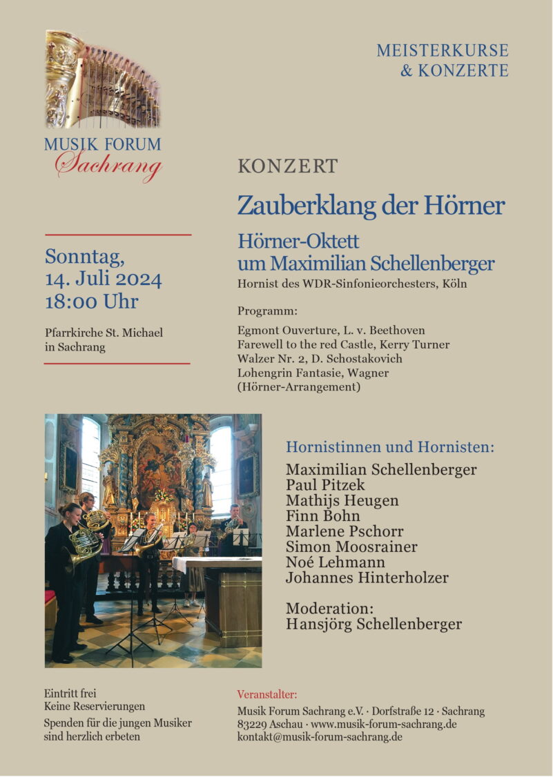 - Am Sonntag, 14.07., 18.00 Uhr, „Zauberklang der Hörner“ Hörner-Oktett um Maximilian Schellenberger, Kirche St. Michael Sachrang.
