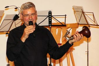 Für das letzte Stück des Abends holte sich das Holzbläserquintett ihren Arbeitskollegen Albert Osterhammer mit seiner Bassklarinette zum gemeinsamen Spiel auf die Bühne. Zusammen mit dem Lokalmatador und musikalischen Leiter der Konzertreihe spielten sie als Bläsersextett „Mladi – Die Jugend“ von Leos Janacek (1854-1928). Der Komponist schildert in einer teils wehmütigen, teils heiteren Autobiographie in Tönen seine Jugend im Mähren des mittleren 19. Jahrhunderts. Mit großer Präzision, differenzierter Artikulation und Spielfreude kommunizierten die sechs Musiker mit viel Kontakt zueinander. Für den nun folgenden lang anhaltenden Beifall bedankten sich die Musiker mit „I Got Rhythm“, einem Jazztitel aus dem Musical Girl Crazy von George Gershwin (1898-1937).