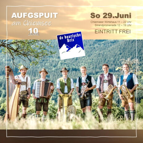 Sonntag, 29. Juni, 11 – 22 Uhr, Chiemseer Wirtshaus und Strandpromenade in Chieming mit 20 Gesangs- und Musikgruppen aus Bayern und Österreich zum finalen Ausklang ab 19 Uhr Boarischer Tanz mit „de Boarische Bris“. Der Eintritt ist frei!