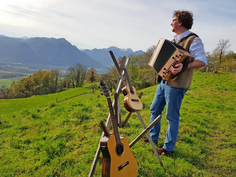 Foto: Helli Resch mit seinen Instrumenten auf dem Samerberg