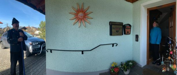 Palmtragen ZwoaPunktNull  – Am Palmsonntag war der Vorstand unterwegs und hat den Aktiven der Blaskapelle Übersee-Feldwies einen Besuch abgestattet. Da der Brauch des Palmtragens nicht mehr so weit verbreitet ist, hat sich der Vorstand der Sache angenommen und hat sich als Palmbua ins Schachterlgwand g’schmissn. Den Musikanten wurde als kleine Geste ein geweihtes Palmbüscherl als Anstecker für Hut, Joppe oder Dirndlgwand überreicht. Da der Palmsonntag, der erste Auftritt der Kapelle im Jahr, nun schon das zweite Mal in Folge ausgefallen ist „und der Musikant nicht zum Boim kommen konnte, kam der Boim nun zum Musikanten.“