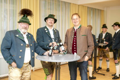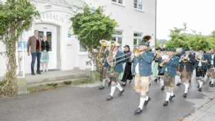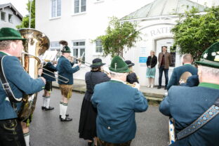 Bürgermeister Herbert Strauch übernimmt für das Musikfest 2025 in Übersee die Schirmherrschaft – Gemeinsam mit der Blaskapelle Übersee-Feldwies hatten der Festleiter Markus Genghammer und Musikvereinsvorstand Christian Kroner den Rathauschef mit Gstanzl angefragt. „Natürlich sog i eng zua, weil i des ois Bürgermeister gern dua“ lautete die Gstanzl-Antwort vom Überseer Bürgermeister Strauch. Passend zu seiner neuen Aufgabe bekam Herbert Strauch einen Schirm überreicht, der bei nassem Wetter vor dem Rathaus gleich eingeweiht wurde.