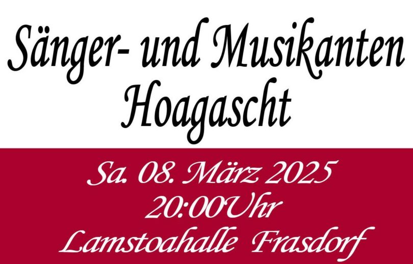 Der Trachtenverein Frasdorf lädt zum Sänger- und Musikanten-Hoagascht, am 8. März 2025 in die Lamstoahalle ein. Die Zusammenstellung der Gruppen organisiert Norbert Hierl, selber begeisterter Musikant mit Sachverstand und Liebe zur echten Volksmusik.