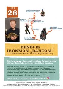 3,86 km Schwimmen, 180 km Radfahren und 42,192 km Laufen – das hat der Musiklehrer an der Grassauer Musikschule Sebastian Krause am Sonntag, den 26. Juli 2020, vor im Rahmen des Benefiz-Triathlons Ironman “dahoam”. Dabei möchte er Geld sammeln zugunsten der Karl und Erna Eigner Stiftung, die den musikalischen Nachwuchs im Achental fördert.