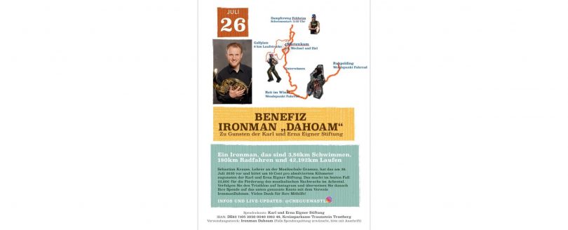 3,86 km Schwimmen, 180 km Radfahren und 42,192 km Laufen – das hat der Musiklehrer an der Grassauer Musikschule Sebastian Krause am Sonntag, den 26. Juli 2020, vor im Rahmen des Benefiz-Triathlons Ironman “dahoam”. Dabei möchte er Geld sammeln zugunsten der Karl und Erna Eigner Stiftung, die den musikalischen Nachwuchs im Achental fördert.