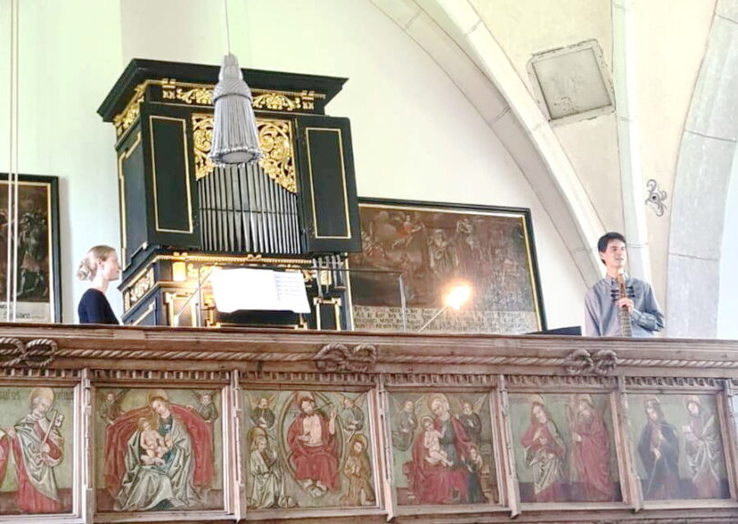 Bericht und Bilder: Christiane Giesen – Die beiden Mitwirkenden der „Harmonice Mundi“ Daniela Niedhammer und Viktor Töpelmann auf der Empore des Ettendorfers Kircherls St. Anna und Vitus -oder: vor dem Altar