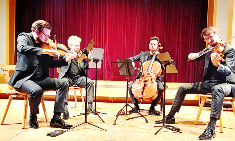 Bericht und Foto: Christiane Giesen – Das Münchner Goldmund Quartett brillierte im Heftersaal Grassau mit „Goldmunds Wanderungen“, einer Veranstaltung der Wolfgang-Sawallisch-Stiftung mit (von links) Florian Schötz und Pinchas Adt (Violinen), Christoph Vandory, Viola, und Raphael Paratore am Violoncello.
