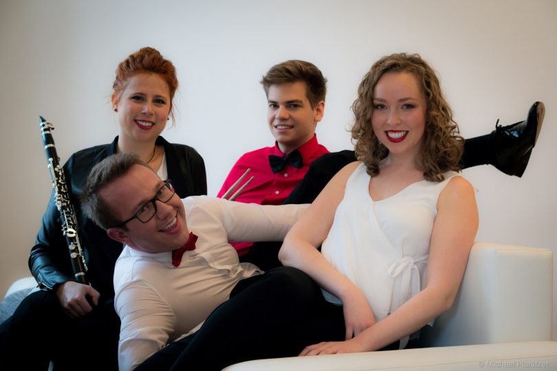 Franziska Wallner Klarinette, Matej Dzido Klavier, Daniel Semmelrock Schlagwerk und Laura Thaller Gesang – die vier jungen Musiker verknüpfen epochen- und länderübergreifend Musik zu einer Einheit aus Klang und Rhythmus und fügen so zusammen, was auf den ersten Blick unmöglich scheint: sie verbinden lateinamerikanische Rhythmen mit Gipsy-Klängen und lassen die Grenzen zwischen Klassik und Weltmusik verschwimmen. Und so wundert es nicht, dass Werke von Artie Shaw, Snarky Puppy und Hans Zimmer genauso auf dem Programm stehen wie von Franz Lehar und George Gershwin. Abgerundet wird das Programm mit Eigenkompositionen von Matej Dzido, der nicht nur Pianist, sondern auch Komponist, Arrangeur und Gründer des Ensembles ist.