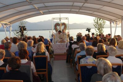 Seit nunmehr 50 Jahren gibt es keine Fronleichnamsprozessionen auf dem Chiemsee mehr, doch vergessen sind sie noch nicht. In Anlehnung an die damaligen Schifffahrts-Wallfahrten hat Pfarrer Martin Strasser/Pfarrverband (PV) Oberes Achental eine spätsommerliche Wallfahrt zur Ehre der Mutter Gottes ins Leben gerufen. Diese fand bei schönstem Sonnenuntergangswetter zum dritten Male statt, beim Altardienst wurde er von Pfarrer Gottfried Grengel vom Pfarrverband Westliches Chiemseeufer und von einem weiteren Altardienst begleitet.