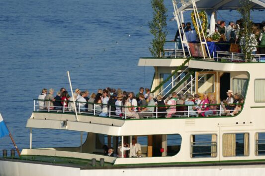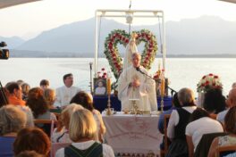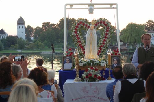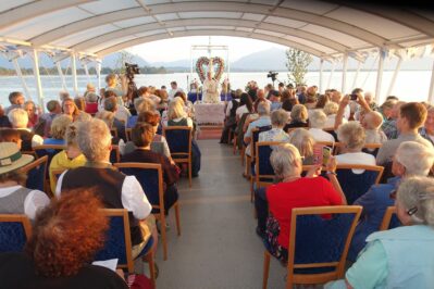 Mit rund 350 Personen an Bord auf Ober-, Mittel- und Unterdeck des Fahrgastschiffes „Edeltraud“ und mit Kapitän Otto Strasser stachen die Gläubigen in See. „Machen wir uns wie die Jünger Jesu auf dem See Genezareth auf den Weg und setzen wir uns auf dem Boot als christliches Symbol mit den Stürmen des Sees und des Lebens auseinander“ – so Pfarrer Martin Strasser bei seinen Willkommensgrüßen. Und Pfarrer Gottfried Grengel fügte in seiner Predigt hinzu: „Bei diesen schönen Anblicken sollte unser erster Gedanke der Dankbarkeit für Landschaft und Gemeinschaft gelten. Rufen wir heute die Einmütigkeit der Christen in Erinnerung, von der die Botschaft der Mutter-Gottes-Erscheinung von Fatima vor 106 Jahren ausging. Praktizieren wir in ihrem Sinne eine selbstlose Liebe, mit der wir bereit sind, jeden Tag umzukehren, Barmherzigkeit zu erfahren und Buße zu tun“. Nach dem Gottesdienst, der von der Gruppe „Gleichklang“ aus Obing mit Gesangs- und Instrumentalmusik gestaltet wurde, stellte Vorsitzender Manfred Benkert (Altötting) vom Verein „Deutschland betet Rosenkranz“ die seit Corona ins Leben gerufenen Gebetsgemeinschaften vor. Bundesweit haben sich in über einhundert Städten und Gemeinden Gebetskreise gebildet, die regelmäßig zum Rosenkranz-Gebet zusammenkommen. Dies geschieht ganz im Sinne der drei Fatima-Bitten von Maria im Jahr 1917: 1. Tägliches Rosenkranzgebet, 2. Weihe an das Unbefleckte Herz Mariens und 3. Sühnekommunion an den ersten Samstagen des Monats. Auch in der Pfarrgemeinde „Mariä Himmelfahrt“ treffen sich die Rosenkranzbeter jeden Mittwoch ab 18 Uhr im Priener Pfarrheim. Für den 13./14.Oktober lud Manfred Benkert zu einer Lichterprozession mit der Fatima-Nationalmadonna zum Brandenburger Tor nach Berlin ein (www.deutschland-betet-rosenkranz.de).