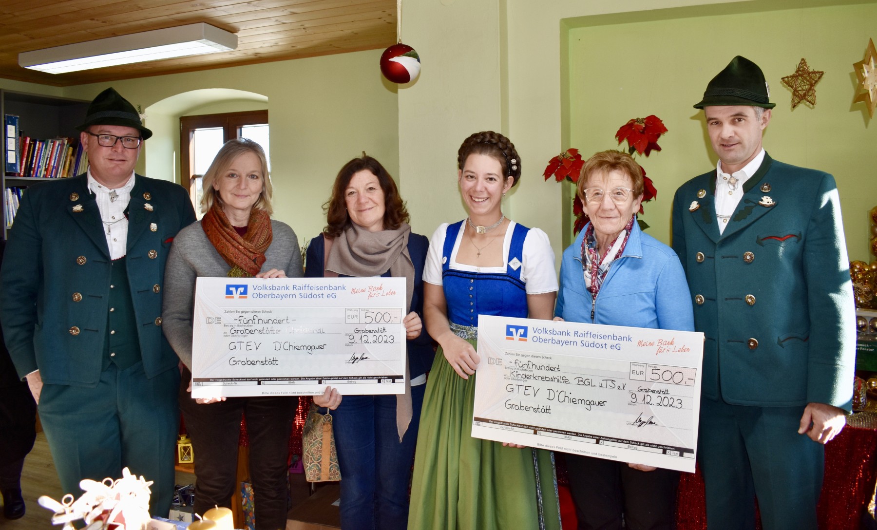 Jeweils 500 Euro spendete der GTEV „d´Chiemgauer Grabenstätt“ rund vier Monate nach seinem 110. Gründungsfest an die Kinderkrebshilfe Berchtesgadener Land und Traunstein sowie an die Aktion „Grabenstätter Christkindl“ des Helferkreises in der Gemeinde Grabenstätt. Bei der Spendenübergabe in Oberteisendorf strahlten die 1. Vorsitzende vom „Verein zur Betreuung krebskranker Kinder und ihrer Familien in den Landkreisen Traunstein und Berchtesgadener Land“ Rosemarie Baumgartner (Zweite von rechts) sowie Angela Wirnshofer (Zweite von links) und Christine Heitauer (Dritte von links) vom Helferkreis in der Gemeinde Grabenstätt (Grabenstätter Christkindl) mit dem 1. Vorsitzenden des Grabenstätter Trachtenvereins Sepp Fleischmann (links), dessen Stellvertreter Ludwig Lukas und Festleiterin Anna Muggenhamer um die Wette. Baumgartner, Heitauer und Wirnshofer bedankten sich herzlich für die großzügige Spende und versicherten, dass man das Geld gut gebrauchen könne.