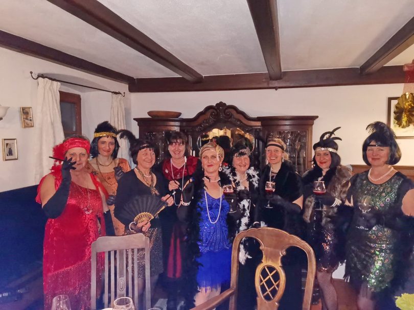 Standesgemäß zum neuen Jahrzehnt wurde der diesjährige Nachbarschafts-Fasching unter dem Motto, “die goldenen zwanziger” von den Nachbarinnen aus Leiten, Griebling, Hoherting & Irgarting abgehalten. Der schon traditionelle Faschingsabend geht diese Jahr das 11. Mal in der Nachbarschaft um und machte heuer bei Margarita Huber in Hoherting halt. Passend zum Motto spielte swingende Musik von Max Rabe im Saloon. Gezirrt von goldenen Dekorationselementen, Kerzenlichter & Champagner wurden die 9 Damen aus der umliegenden Nachbarschaft an den Tisch geladen. Die Gäste geziert von schillernden Pailletten Kleidern und Federboas drehten die Zeit um 100 Jahr zurück. Nicht nur die Kleidung, – auch das Kulinarische wurde dem Thema