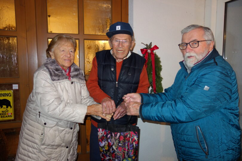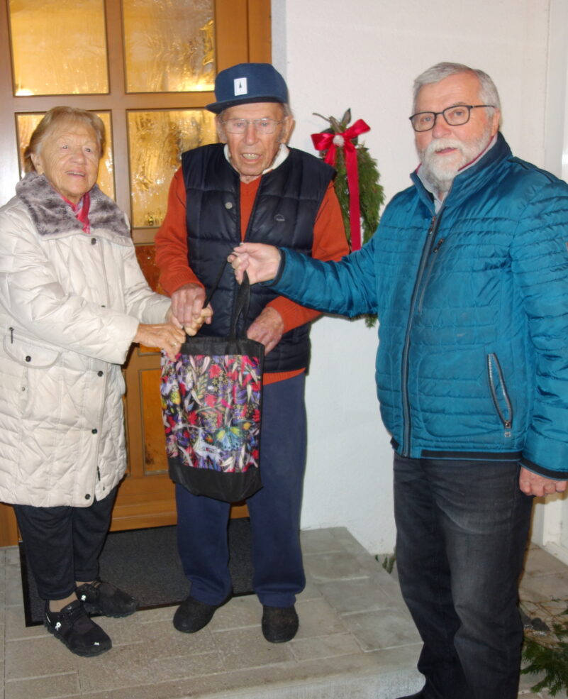 Fotos: Hötzelsperger – Fritz Seipel überbringt Günther und Margarethe Bär aus Atzing die gewünschten Einkäufe. Das Ehepaar Bär (beide 95 Jahre alt) ist seit nunmehr 70 Jahren verheiratet und fühlt sich in Prien-Atzing richtig wohl – wohl auch wegen der hilfsbereiten und guten Nachbarschaft.