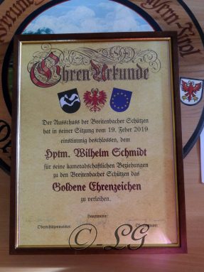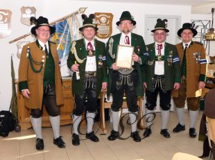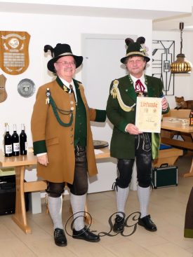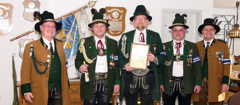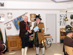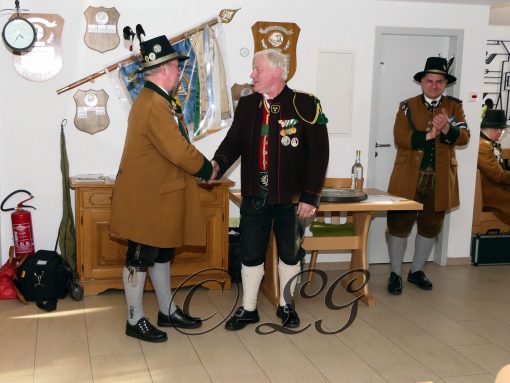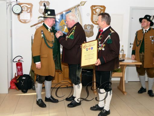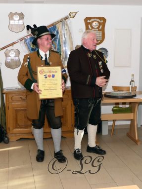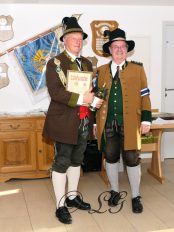 Sichtlich und freudig überrascht war Hauptmann Wilhelm Schmidt von der GSK Raubling, als ihm vom Hauptmann der Breitenbacher Schützen Josef Gruber das Goldene Ehrenzeichen samt Urkunde für seine kameradschaftlichen Beziehungen zu den Breitenbacher Schützen ans Revers gesteckt wurde.