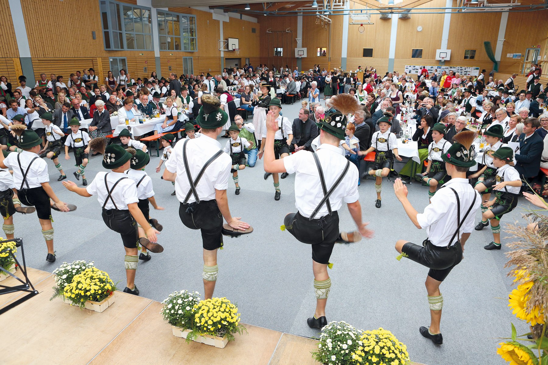 Auftritt der Trachtenjugend mit einem Plattler bei den Feierlichkeiten in der Turnhalle.