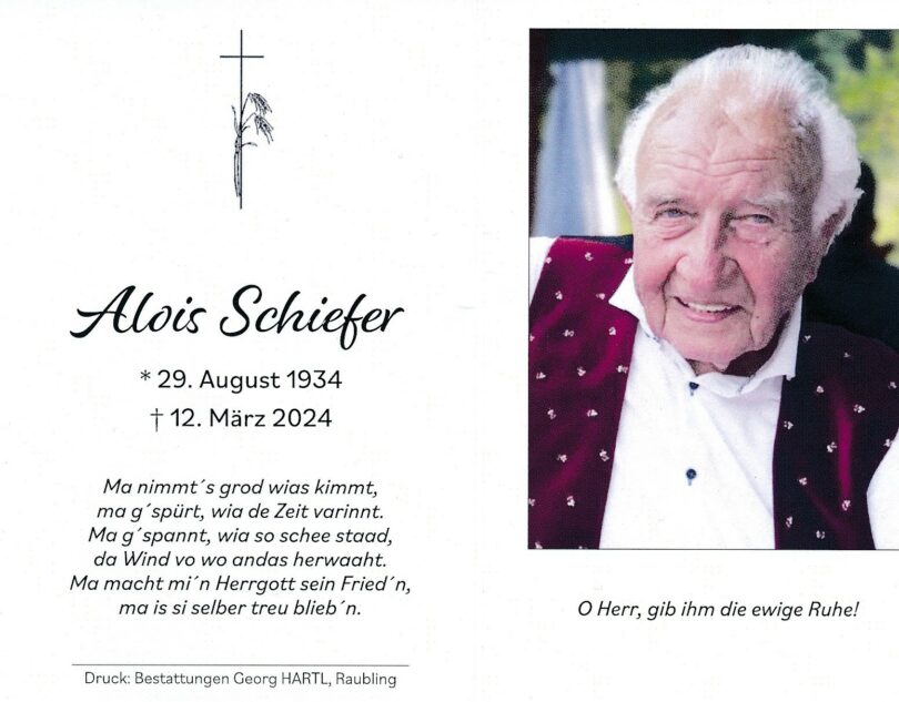 Im gesegneten Alter von fast 90 Jahren verschied Alois Schiefer aus Neubeuern friedlich, betreut von seiner Ehefrau Maxi und der Familie mit zwei Kindern und Enkeln, in seinem Anwesen an der Innstraße. Ein arbeitsreiches Leben, geprägt von den Veränderungen, die mitgetragen werden mussten, fand sein Ende. Zufriedenheit und sein stiller Humor, die gerne geteilt wurden, sowie sein verschmitztes Lächeln, wenn er in Gesellschaft unterwegs war, zeichneten den “Schiefer Lois” aus.