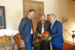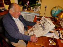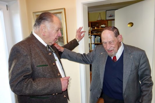 Fotos: Hötzelsperger – Prof. Günter Loos mit der Ausgabe der Chiemgau-Zeitung an Silvester 2017, dem Tag seines 80. Geburtstags / Erinnerungen an die Gratulation durch die Gemeinde Prien mit ihren Bürgermeistern Jürgen Seifert und Hans-Jürgen Schuster sowie vom Diakonieverein durch Wolfgang Schuster, der vor kurzem ebenfalls verstarb.