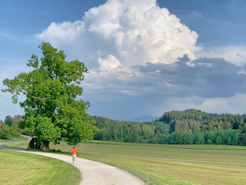 Auch wenn die Beschränkungen in der Corona-Krise stückweise gelockert werden, so empfiehlt es sich doch, den Freizeitsport und die Natur nach Möglichkeit ohne weitere Kontakte zu genießen – so wie dieser Jogger auf dem Weg im Priener Westen alleine in Richtung Siegharting unterwegs ist.