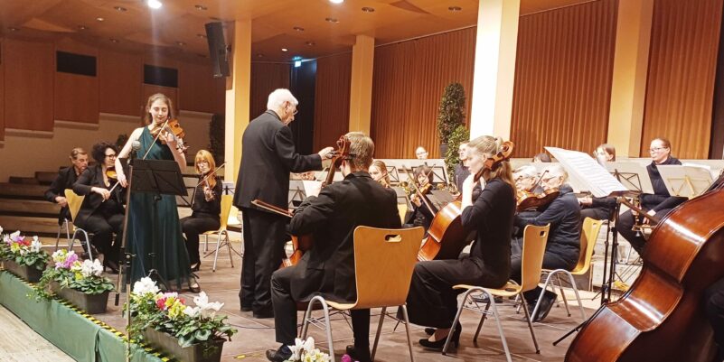 Einleitend spielten die rund 20 Mitglieder des Musikkollegiums Joseph Haydns „Marcia“, eine flotte Einleitung zum folgenden Konzert für Violine und Orchester G-Dur von Joseph Haydn (1732 bis 1809) in drei Sätzen. Jeden der drei Sätze spielte einer der jungen Solisten auf der Geige: Sebastian Rein das Allegro moderato, Anastasia Vasileva das Adagio und das Allegro Michael Muransky. Die drei Violinistin, alle erst zwischen 15 und 17 Jahre alt, bereits mit verschiedenen Preisen bei Jugend musiziert ausgezeichnet, begeisterten durch ihr versiertes, harmonisch abgestimmtes Spiel. Keiner der vielen Zuhörer konnte zweifeln, dass hier hoch begabte Nachwuchstalente auf der Bühne standen, denen sicher eine Musikerkarriere bevorsteht.
