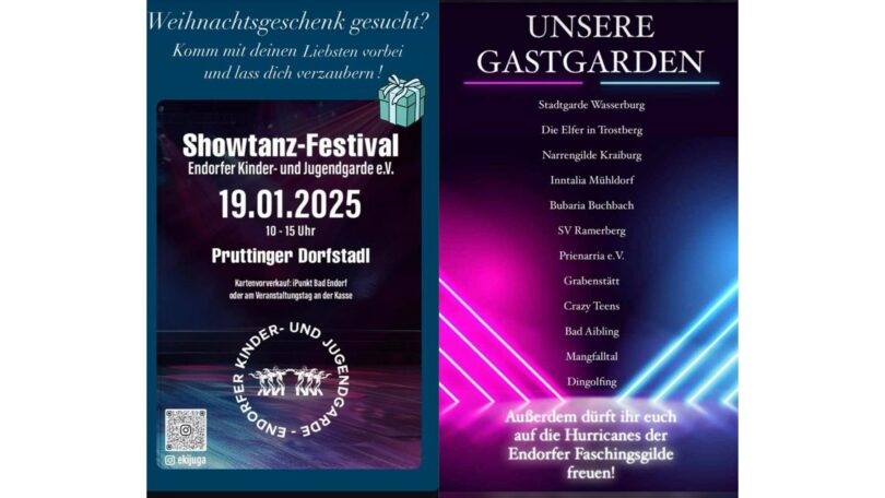 Am Sonntag, 19. Januar , lädt die Endorfer Kinder- und Jugendgarde e.V. zum ersten Showtanz-Festival im Pruttinger Dorfstadl ein. Zwischen 10 und 15 Uhr präsentieren zahlreiche Gastgarden sowie die Hurricanes der Endorfer Faschingsgilde ein buntes Programm voller Tanz und Unterhaltung.