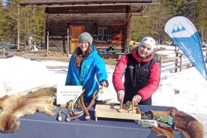 Die Nationalpark-Mitarbeiterinnen Theresa Schöbinger (r.) und Veronika Heel (l.) informieren Besucher am mobilen Stand im Klausbachtal zum Thema „Tierspuren“.