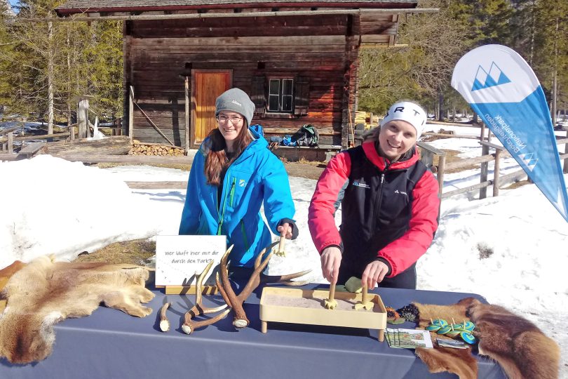 Die Nationalpark-Mitarbeiterinnen Theresa Schöbinger (r.) und Veronika Heel (l.) informieren Besucher am mobilen Stand im Klausbachtal zum Thema „Tierspuren“.