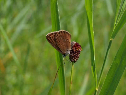 Dirk Alfermann ging besonders auf die Wiesenbrüter ein, von denen viele vom Aussterben bedroht sind, zum Beispiel auf das Braunkehlchen und die Bekassine. Dank der naturverträglichen Bewirtschaftung durch mehrere ortsansässige Landwirte finden diese Vögel hier im Grabenstätter Moos noch einen geeigneten Lebensraum. Auch seltene Orchideenarten wie das Sumpfknabenkraut sind hier zu bewundern. Zu den Besonderheiten dieser Gegend zählt zudem der Dunkle Wiesenknopfameisenbläuling, eine Schmetterlingsart mit einer ganz besonderen Fortpflanzungsstrategie. Seine Weibchen legen einzelne Eier auf die Blütenknospen des Großen Wiesenknopfes ab. Nach dem Schlüpfen ernähren sich die Raupen zunächst von der Blütenknospe dieses Rosengewächses, ehe die Raupen sich von dort zu Boden fallen lassen und von Knotenameisen in deren Nest getragen werden. Da sie in der Lage sind, den Geruch der Ameisen anzunehmen, werden sie wie die eigene Brut gepflegt; und das, obwohl sie sich räuberisch von den Eiern und Larven der Ameisen ernähren, bis sie sich im Frühjahr verpuppen. Sobald der Schmetterling aus der Puppe schlüpft, muss er sofort das Ameisennest verlassen, da er nun ungetarnt ist und selbst zur Beute der Ameisen werden würde.