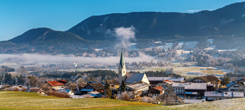 Bericht und Foto: Rainer Nitzsche – Törwang (vorn) und Grainbach (dahinter) am Samerberg: Nebelschwaden ziehen durchs Hochtal, während Rauhreif Dächer und Bäume überzuckert.