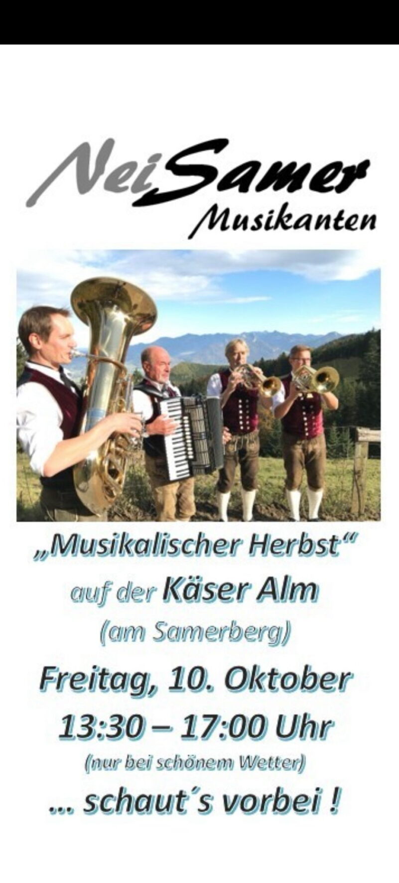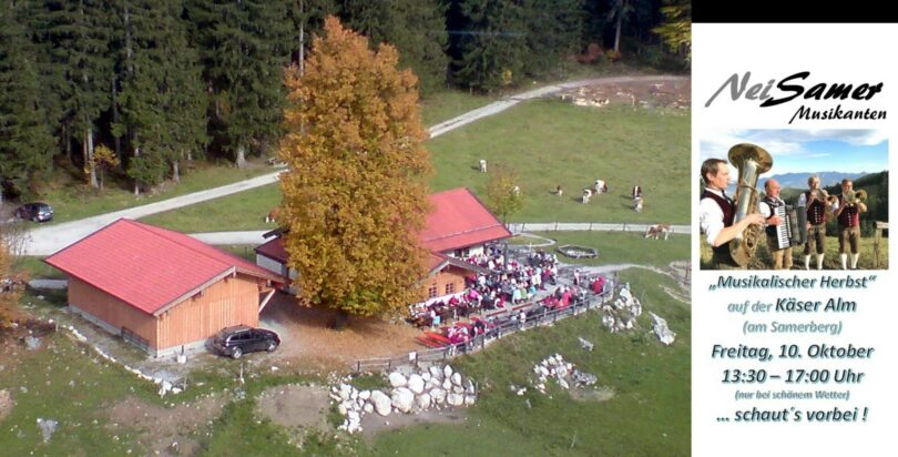 Am heutigen Freitag, 10. Oktober gastieren und spielen im Rahmen des “Musikalischen Herbstes” die NeiSamer-Musikanten auf der Käseralm am Samerberg.