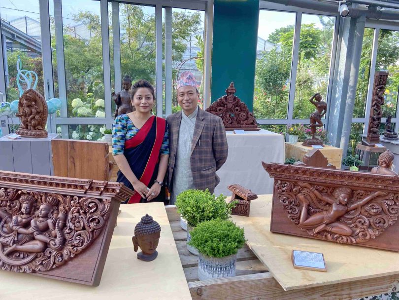 Im Rahmen der Reihe „Kunst im Gewächshaus“ war der Künstler Indra Prasad Shilpakar aus Nepal für ein paar Tage in Prien a. Chiemsee zu Gast. Der 2017 von der Nepal Academy of Fine Arts als bester Holzschnitzer nach traditioneller Schnitzkunst ausgezeichnete Künstler zeigt seine Kunstwerke in fünf bayerischen Gärtnereien. Eingeladen und organisiert hierzu hat die Familie Benkert aus dem fränkischen Waigolshausen, die seit fast 30 Jahren intensive Beziehungen nach Nepal pflegen und dort unter anderem einen Schulhausbau unterstützt haben. In Prien stellte Gärtnermeister Philipp Rother seine Gewächs-Räumlichkeiten zur Verfügung. Zwischen den Pflanzen und Blumen kamen die Kunstwerke mit den Motiven „Himmlische Wesen“, „Drachen“, „Musikanten und Gottheiten“ sowie mit den Themen „Fruchtbarkeit“ und „Weisheit“ bestens ins Bild. Die nächsten Ausstellungsorte sind vom Donnerstag, 7. Juli bis Samstag, 9. Juli die Gartenwelt Dauchenbeck in Fürth und vom 15. bis 17. Juli die Gärtnerei Benkert in Waigolshausen. Vor Prien waren noch Ausstellungen in der Premiumgärtnerei Scherdi in Hofstetten und im Kiefl Gartencenter in Gauting bei München.