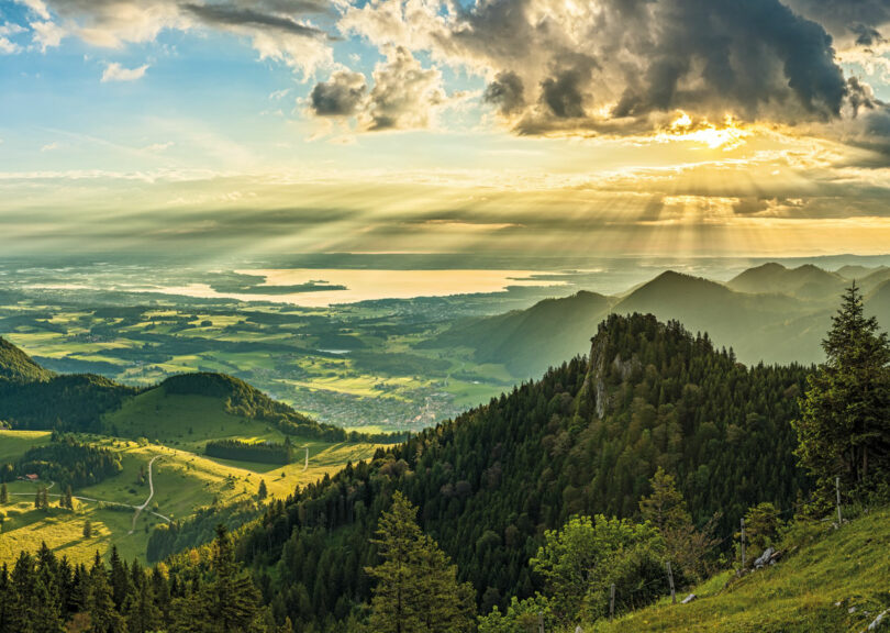 Foto: Josef Reiter – Kalendertitel: Morgendliches Licht vom Laubenstein in das Chiemgauer Voralpenland