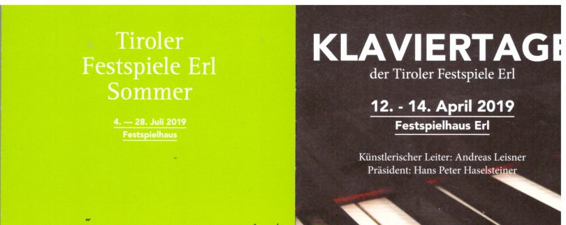 Ab sofort ist das Sommerprogramm für die Tiroler Festspiele in Erl erhältlich. Das Programm bietet vom 4.-28. Juli an 24 Abenden Vertrautes und Neues unter der künstlerischen Leitung von Andreas Leistner. Ebenso erhältich ist das Programm für die Klaviertage vom 12. bis 14. April im Festspielhaus Erl. Karten gibt es unter karten@tiroler-festspiele.at und weitere Informationen sind erhältich unter www.tiroler-festspiele.de.