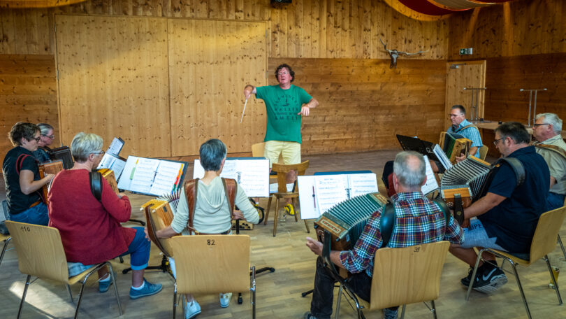 Fotos: Rainer Nitzsche – Das Harmonika Orchester bei einer Probe beim Badwirt in Roßholzen unter Leitung von Helmut Resch