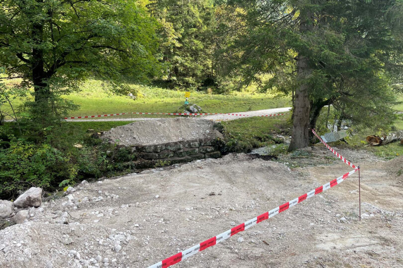 Die alte, baufällige Holzbrücke an der Zufahrt zur Bindalm im Klausbachtal wurde abgerissen und wird in den kommenden rund fünf Wochen durch einen Neubau aus Stahl und Holz ersetzt.