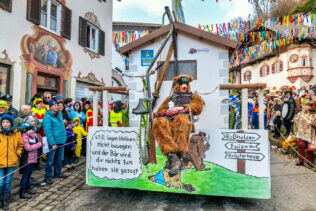 Neben den großen Bildern lebte der Zug von seinen satirischen Spitzen. Wortspiele und aktuelle Themen wurden humorvoll verarbeitet – und auch ein ganz regionaler Aufreger bekam sein Fett weg: Die jüngste „Bärsichtung“ am Samerberg, die vor ein paar Wochen für Gesprächsstoff sorgte, wurde augenzwinkernd aufgegriffen. Eine Gruppe ließ den „Bären“ gleich mehrfach auftreten – inklusive Schildern, Sprüchen und einer gehörigen Portion Selbstironie. So hieß es in Dialekt: „Bei de Samer … teppt da Bär – mim Tourismus geht nix mea“ – ein Seitenhieb, der beim Publikum genau den richtigen Ton traf: frech, aber nie bösartig. Auch vermeintliche „Tipps“ zur Bär-Begegnung wurden als Gag verarbeitet und sorgten für Lacher am Streckenrand.