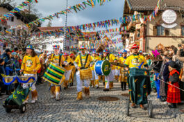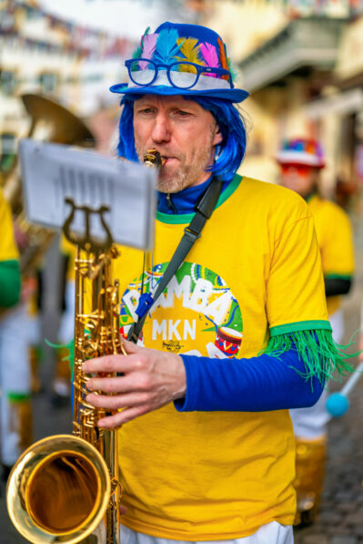Mit Trommeln und Bläsern heizte die in Gelb gekleidete, brasilianisch angehauchte Musikkapelle Neubeuern dem Faschingszug ein – der Marktplatz wurde zur Open-Air-Bühne unter bunten Girlanden.