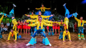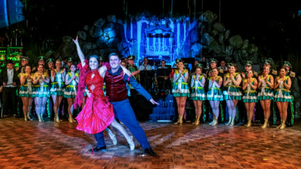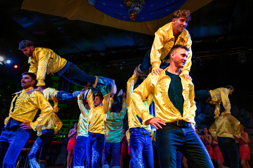 Mitten in der Show: spektakuläre Hebefigur vor dem applaudierenden Hofstaat – Fasching als Bühnenkunst.