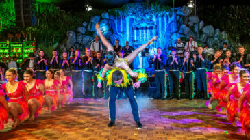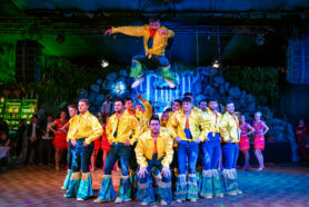 „Rio“ im Porträt: farbenfrohe Federkopfschmuck-Highlights und strahlende Gesichter – Samba-Flair in der Beurer Halle.