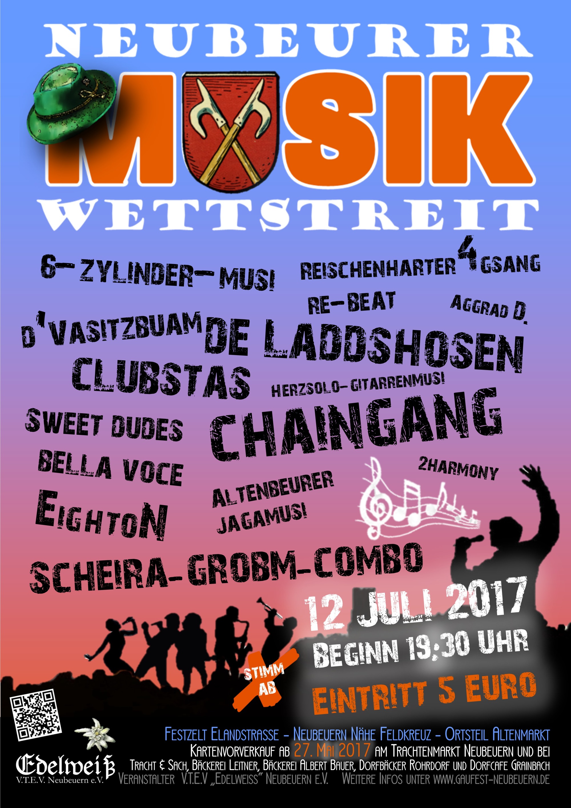 Wer seine Gemeinde oder seine Lieblingsgruppe mit seiner Stimme unterstützen will, einen abwechslungsreichen und spannenden Abend verleben und vielleicht sogar den Publikumspreis gewinnen möchte, muß unbedingt dabei sein, am 12. Juli 2017 Eintritt 5 Euro Beginn 19.30 Uhr Einlaß ab 18.30 Uhr in Neubeuern im Festzelt an der Elandstraße!