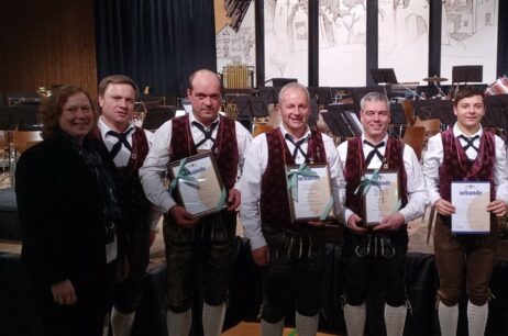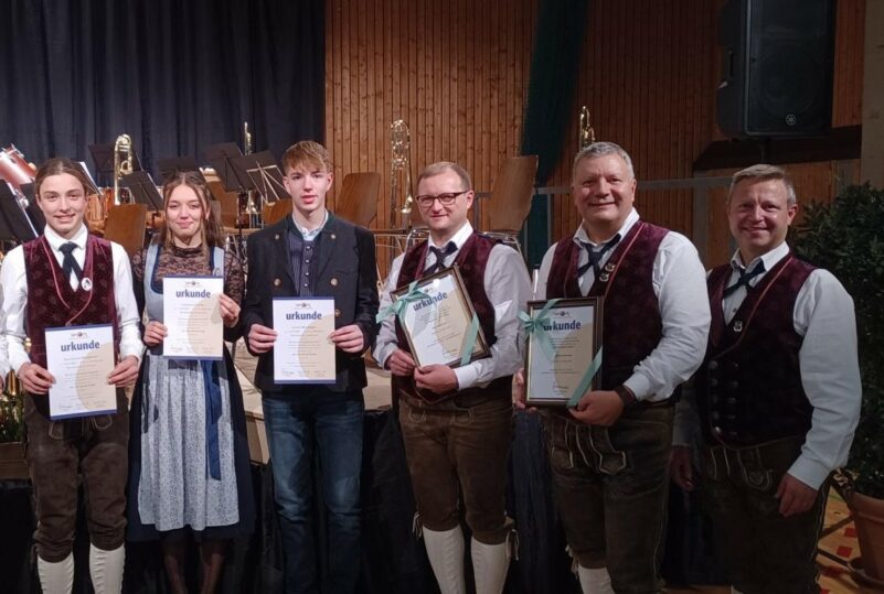 Diese wurden heuer von Michaela Haindl, Bezirksjugendleiterin des Musikbundes, vorgenommen. Folgende Nachwuchsmusikanten erhielten ein Leistungsabzeichen: In Bronze Anna Lena Grießer‐ (Klarinette) und Lorenz Wachinger (ebenfalls Klarinette), in Silber Moritz Eutermoser (Trompete) und Maximilian Königbauer (Schlagzeug).