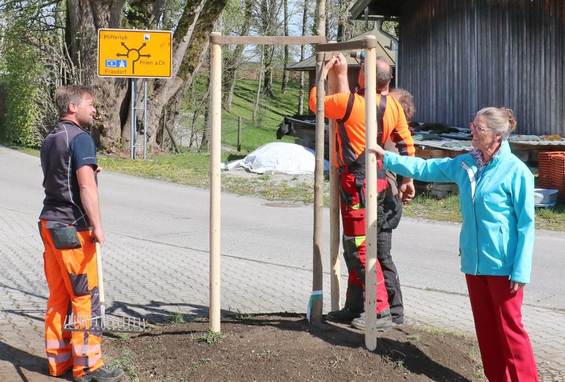 „Zwölf Jahre als Bürgermeisterin im Amt, ergibt zwölf Bäume für die Gemeinde Frasdorf“. Bürgermeisterin Marianne Steindlmüller scheidet am 30. April nach zwei Amtsperioden aus dem aktiven Dienst aus. Als kleines Dankeschön an alle Gemeindebürger hat sie für jedes einzelne ihrer Bürgermeisterjahre einen Baum gestiftet. Jetzt ist sie mit den Männern des Bauhofes im ganzen Gemeindegebiet unterwegs und pflanzt dieses Dutzend Bäume auf den öffentlichen Flächen. Am Regenrückhaltebecken von Umrathshausen werden künftig zwei Birnbäume und eine Vogelkirsche stehen, am Kindergarten in Frasdorf zwei Apfelbäume und am Wildenwarter Feuerwehrhaus ein Bergahorn als Ersatz für die bisherige Kastanie. Weitere Standplätze fanden sich in Umrathshausen in der Humpretstrasse und am Frasdorfer Schwimmbad. Zusammen mit dem Verantwortlichen aus dem Landratsamt überprüfte Bauhofleiter Josef Schäffer den Zustand der gemeindlichen Bäume und suchte gleichzeitig geeignete Standplätze für die neuen zwölf Bäume der Bürgermeisterin. Parallel zur Baumpflanzaktion werden die gemeindlichen Grünflächen an den Radwegen auf Anraten des Kreisfachberaters für Gartenkultur und Landespflege mit einem Blumenwiesensaatgut bienengerecht aufgewertet. Als Ersatz für die bestehende dürre Fichtenhecke am Schwimmbad wurden 20 Meter Wildsträucherhecke aus Hartriegel, Kornelkirsche, Pfaffenhütchen und Schneeball eingesetzt.