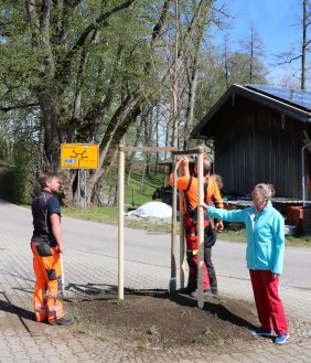– Bürgermeisterin Marianne Steindlmüller und die Männer vom Bauhof pflanzen einen neuen Bergahorn vor dem Wildenwarter Feuerwehrhaus