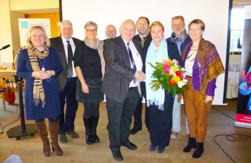 Bericht und Foto: DEHOGA Bayern – Bildunterschrift: Neuwahlen der oberbayerischen DEHOGA Bayern-Bezirksvorstandschaft: Franz Bergmüller (Mitte) gratuliert der neuen Bezirksvorsitzenden Jutta Griess. Mit im Team (v.l.): Revisorin Lydia Hofherr, 1. stellvertretender Bezirksvorsitzender Christian Schottenhamel, Schriftführerin Sabine Detter, Kassier Martin Osterrieder, Franz Bergmüller, 2. stellvertretender Bezirksvorsitzender Adalbert Lutz, Bezirksvorsitzende Jutta Griess, Revisor Harald Faul sowie Revisorin Anna Elisabeth Hofmeier.
