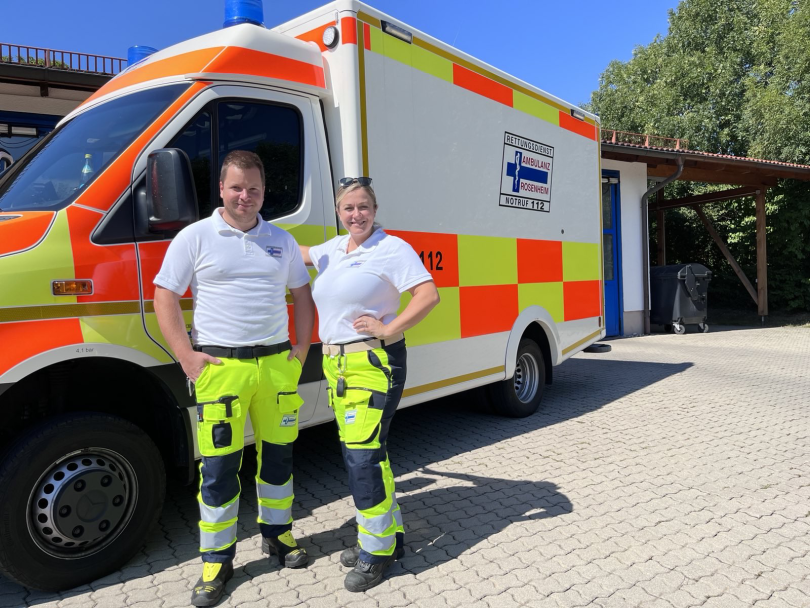 Foto: Wachleiter Michael Roßrucker und Rettungsdienstleiterin Michaela Götschl (v.l.) freuen sich über ihr neues Outfit. – von schweren Verkehrsunfällen bis hin zu kritischen häuslichen Notfällen. Die Einsatzkräfte retten täglich leben, weshalb eine maßgeschneiderte Uniform unverzichtbar ist. Aus diesem Grund erhält jeder Rettungsdienstmitarbeiter der Ambulanz Rosenheim in den kommenden Tagen personalisierte Einsatzhosen und -jacken.