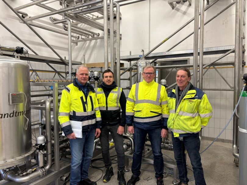 Bericht und Foto: Auerbräu – Technischer Geschäftsführer Dipl. Ing. Thomas Frank (1.v.l.), Braumeister Karl-Heinz Silichner (3.v.l.) und die Bauleiter der Firma Pentair vor einem Teil der neuen Filtration