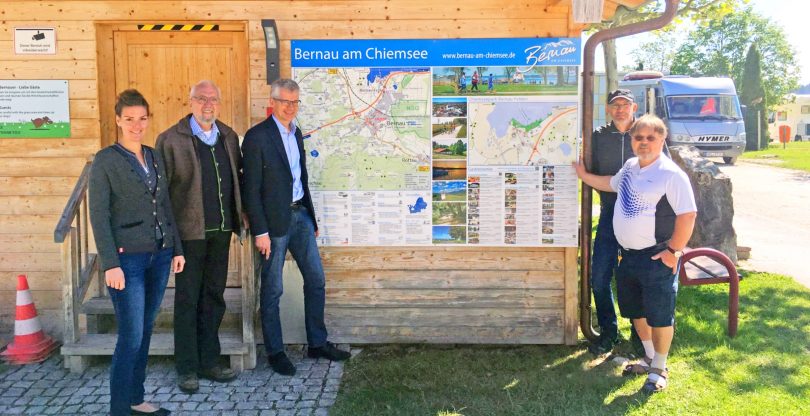 Bildunterschrift: v.l.n.r. Janina Frank von der Tourist-Info, Claus Linke von der Chiemseeagenda, Bürgermeister Philipp Bernhofer, Thomas Schneider und Ralf Bayer vom Tenniszentrum freuen sich über die übersichtliche Informationsmöglichkeit für die Campinggäste am Wohnmobilstellplatz.