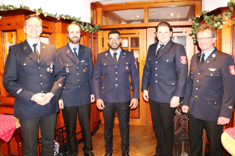 Bericht und Foto: Heinrich Rehberg – Die neue Führungsmannschaft der Feuerwehr Aschau: Kommandant Markus Vordermayer (zweiter von rechts) und seine beiden Stellvertreter Marco Weisser (dritter von rechts) und Josef Meier (zweiter von links) mit Bürgermeister Simon Frank (links) und Kreisbrandmeister Stefan Pfliegl (rechts)