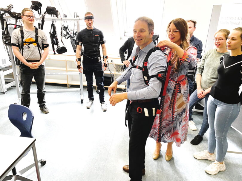 Bericht und Bild: TH Rosenheim – Professorin Franziska Klein, Leiterin des neuen Labors für medizinische Assistenzsysteme, demonstriert ein sogenanntes Exoskelett, das bei körperlichen Tätigkeiten den Körper unterstützt. Bild: Anton Maier