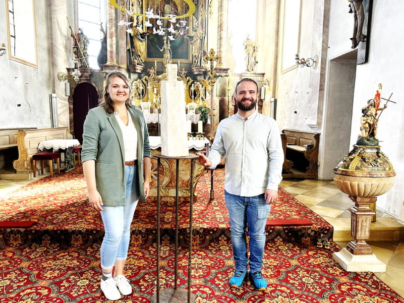 -das Kunstwerk „Inklusion“, eine Skulptur aus dem „Denk-mal-Nach-Weg“ sieht der Holzbildhauer Marco Bruckner (re) genau passend für seine Heimatpfarrei, die von Jaqueline Egold (re) Gemeindereferentin im Pfarrverband Obing stellvertretend übernommen wird.